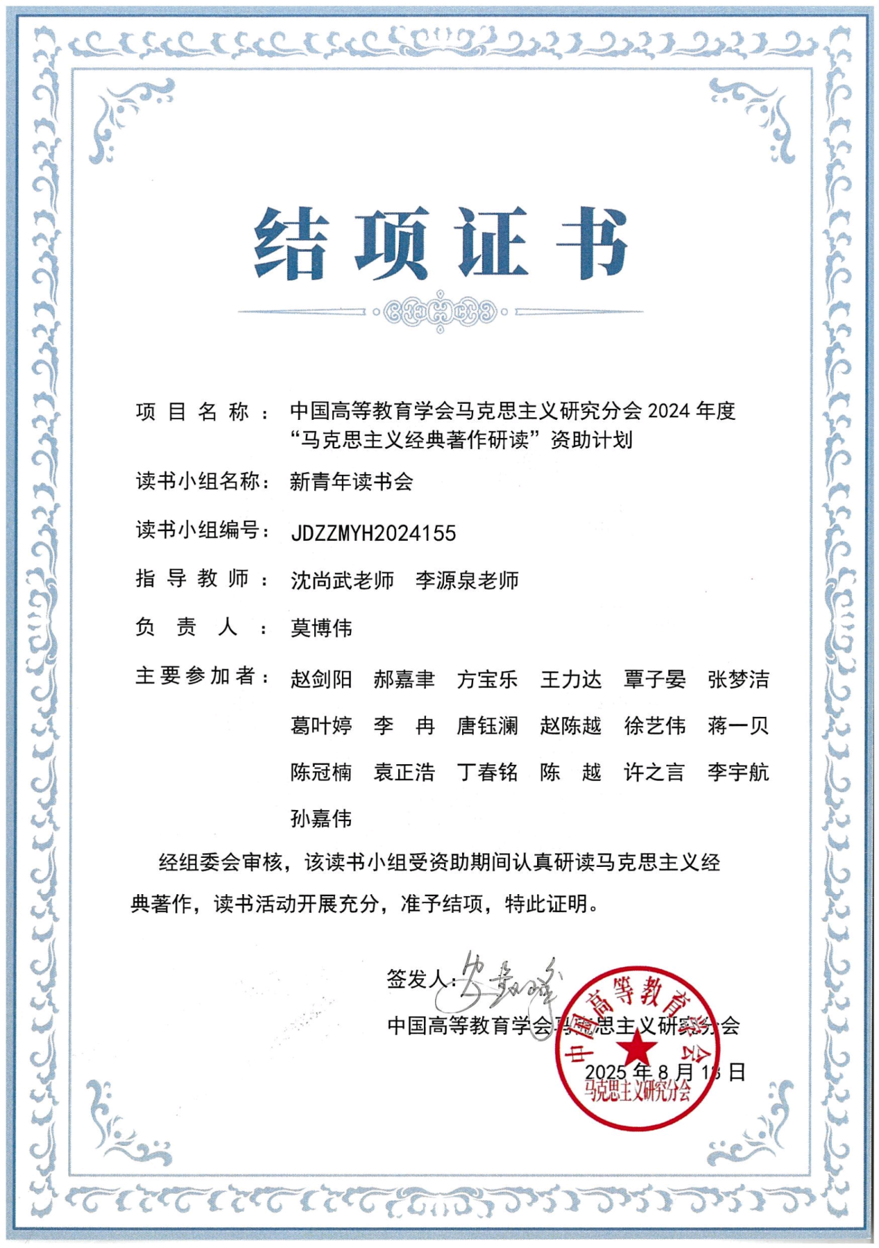 近日,上海师范大学天华学院“新青年读书会”在中国高等教育学会马克思主义研究分会(马研会)2024年度“马克思主义经典著作研读”资助计划下顺利结项,并被评为“优秀读书小组”,指导教师沈尚武、李源泉获评“优秀指导教师”,标志着本阶段读书学习圆满完成。