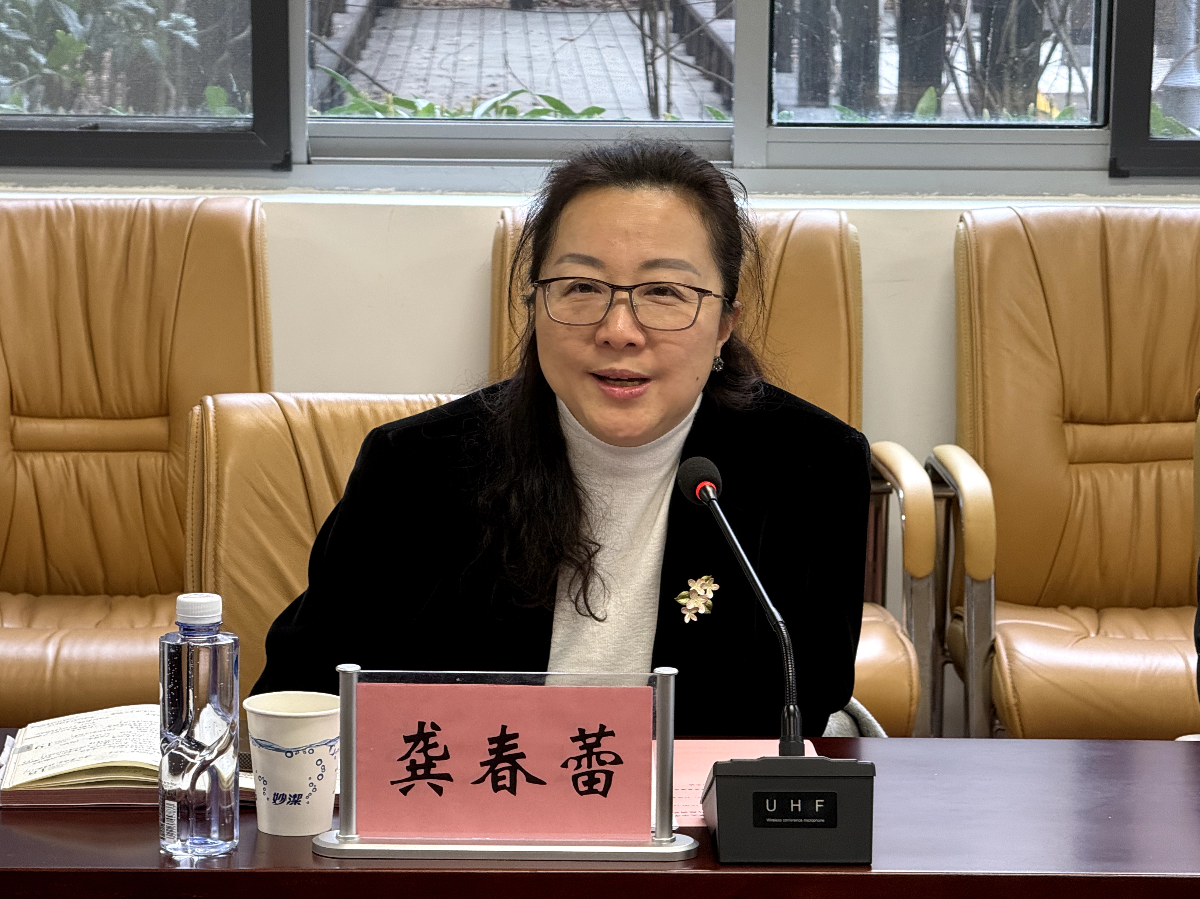 在随后的座谈环节,高建华书记、龚春蕾校长与马院专任教授孙叶青,新晋副教授黄播、王琼平,以及青年教师代表贾孟云等围绕马院高质量发展进行了深入交流。龚春蕾校长对马院在过去一年取得的成绩给予充分肯定,认为马院发展举措扎实、成效初显,希望马院未来能够继续坚守政治担当,聚焦内涵式发展,在科研突破和课程改革上持续发力的同时,在服务学校发展大局中充分发挥自身的理论优势,将育人方案更好地转化为教学实践成果。